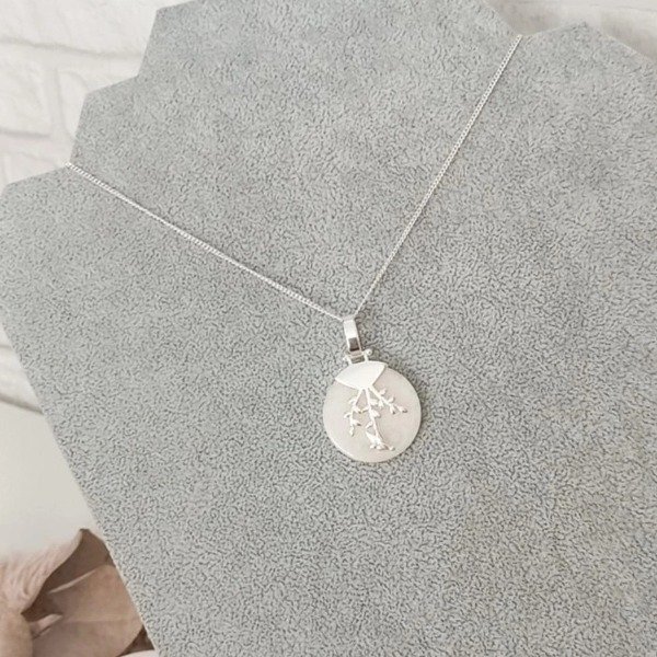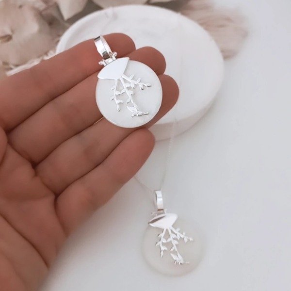 DIJE COLGANTE RAMAS Y COLIBRÍ CON BASE PIEDRA DE NACAR