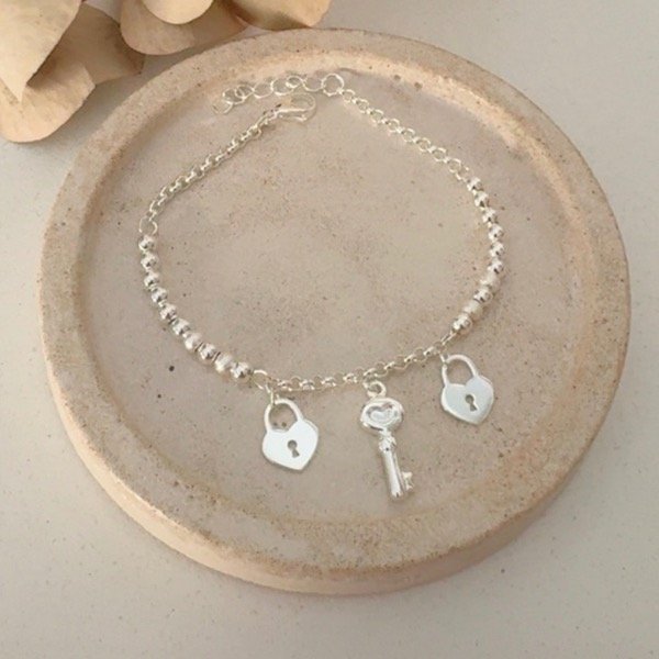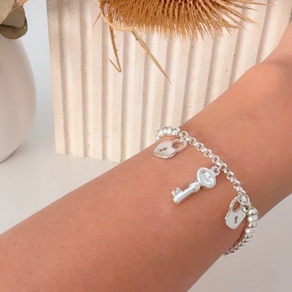 PULSERA CON BOLITAS Y DIJES COLGANTES LLAVE Y CANDADO
